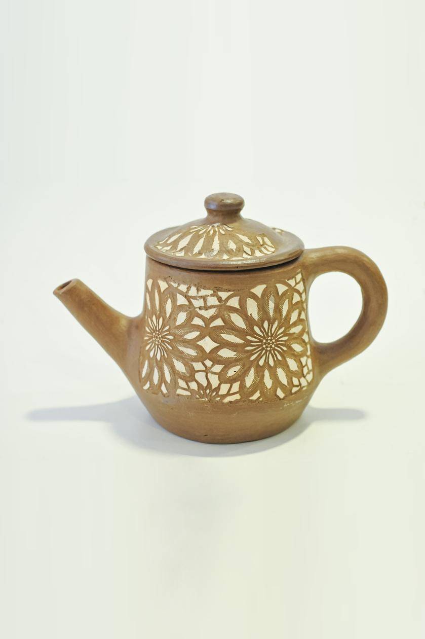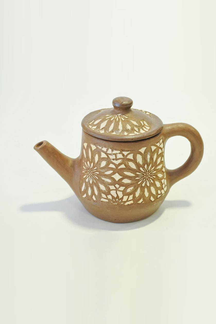 O “Bule em Argila – Coleção Labirinto” é uma peça artesanal única, feita à mão com argila, apresentando intricados detalhes que lembram um labirinto.