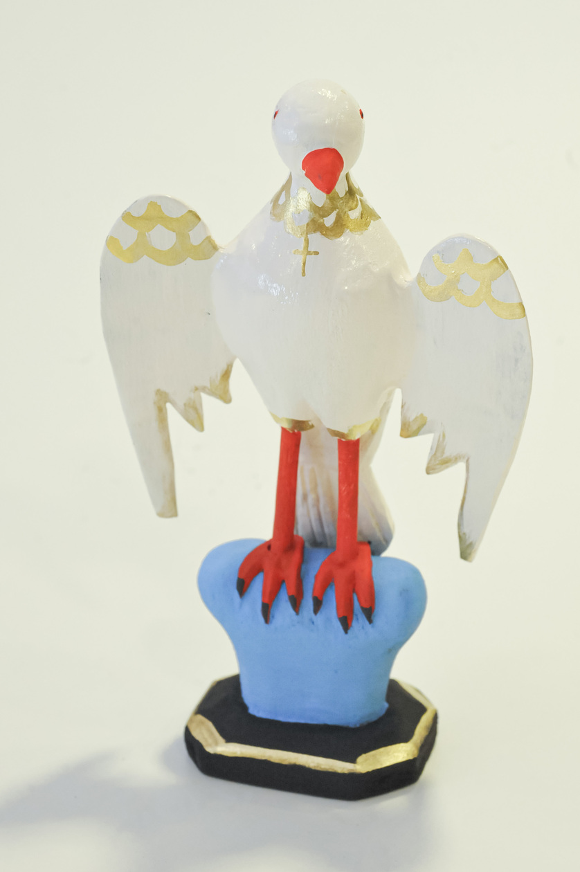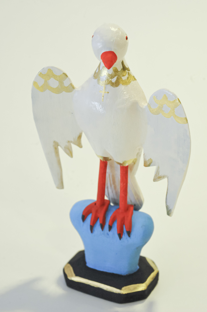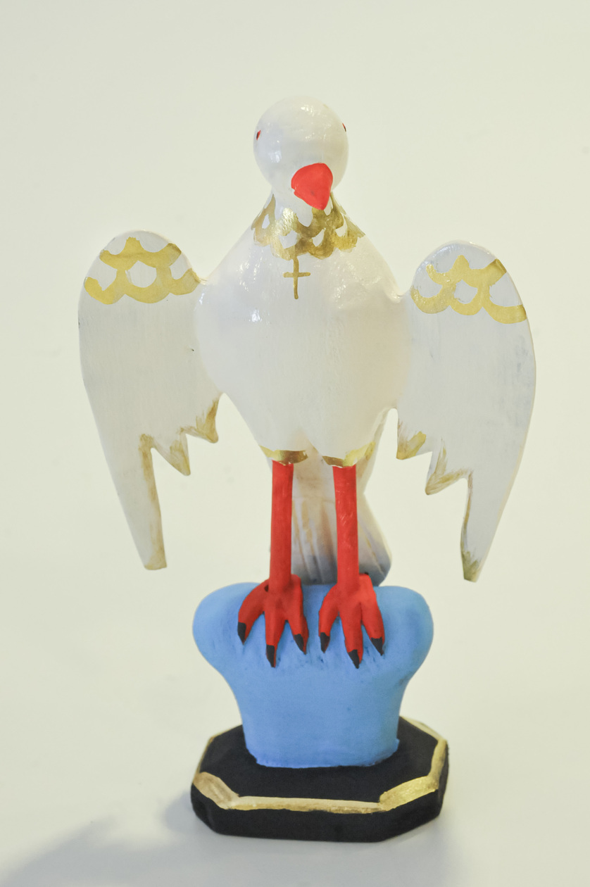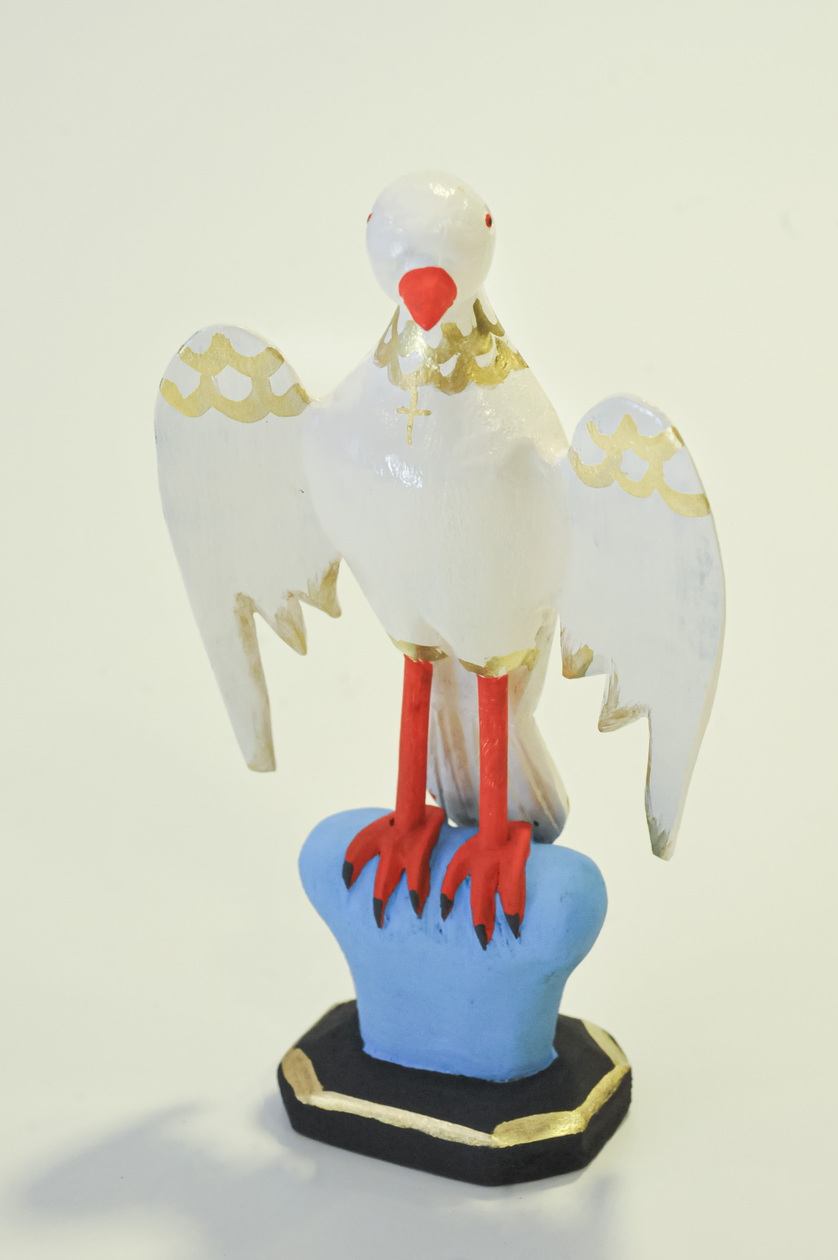 A “Escultura em Madeira – Divino Espírito Santo” é uma peça religiosa esculpida à mão que simboliza a paz e a inspiração divina.